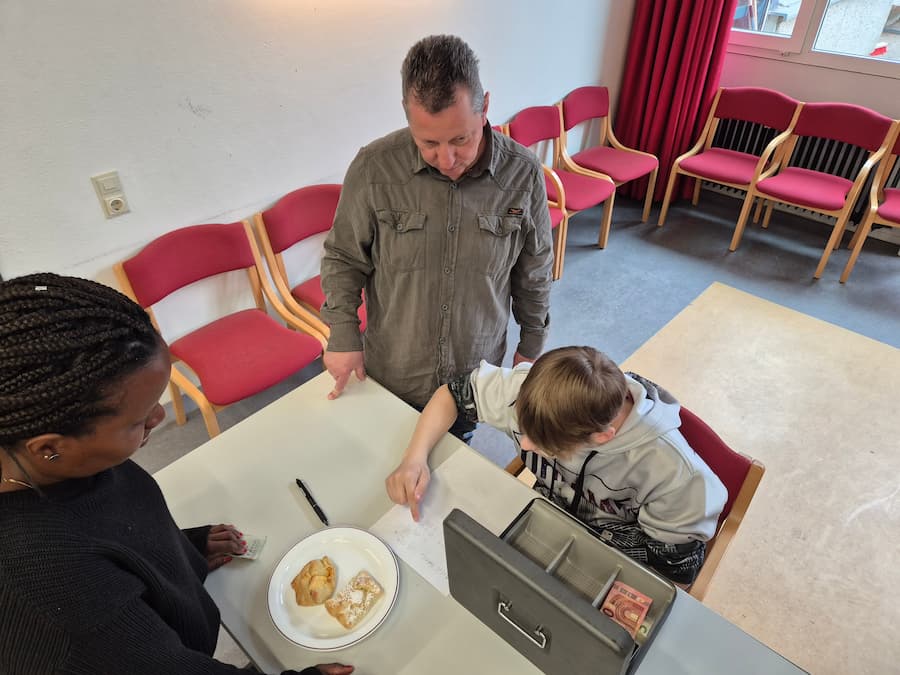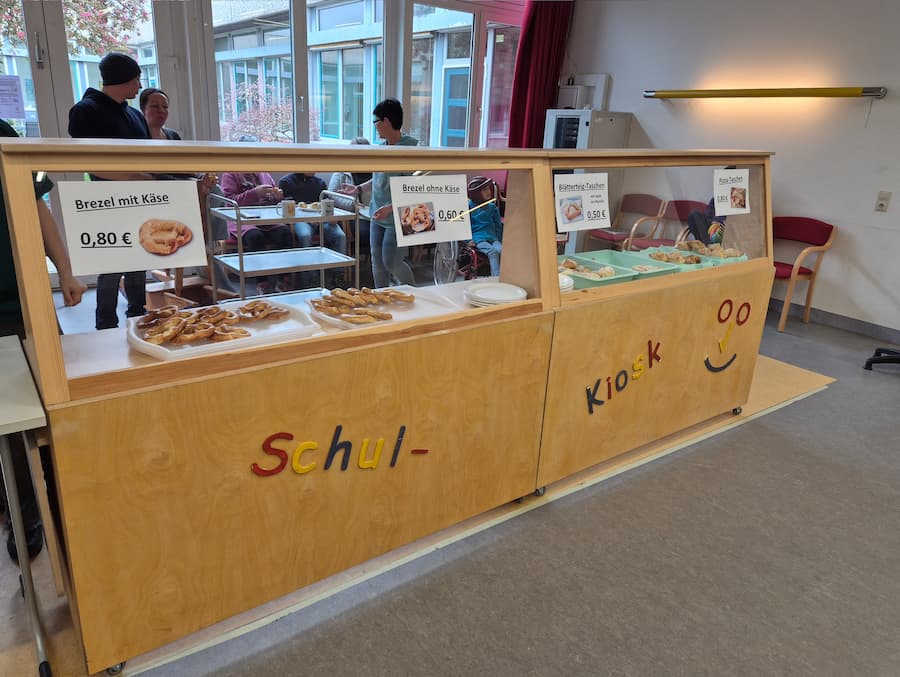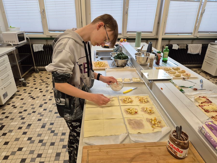 Die Genusswerkstatt hat immer viel zu tun. Wir stellen Marmelade, Öle und andere Dinge für den Verkauf her. Fast jeden Dienstag machen wir einen Schülerkiosk, wo die SchülerInnen sich Brezeln und gefüllte Blätterteigtaschen kaufen können. Bei besonderen Anlässen, wie einem runden Geburtstag eines Erwachsenen, servieren wir ein leckeres Mittagsessen.