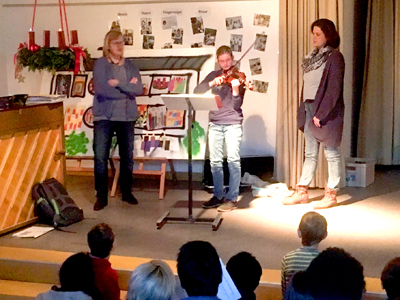 Jeden Dienstag trifft sich die Schulgemeinschaft zum Adventssingen auf der Bühne. Lea hat uns auf der Geige begleitet und wir haben gemeinsam Weihnachtslieder gesungen.