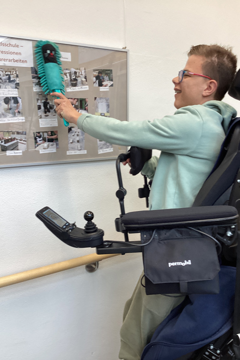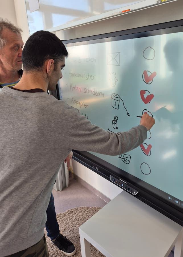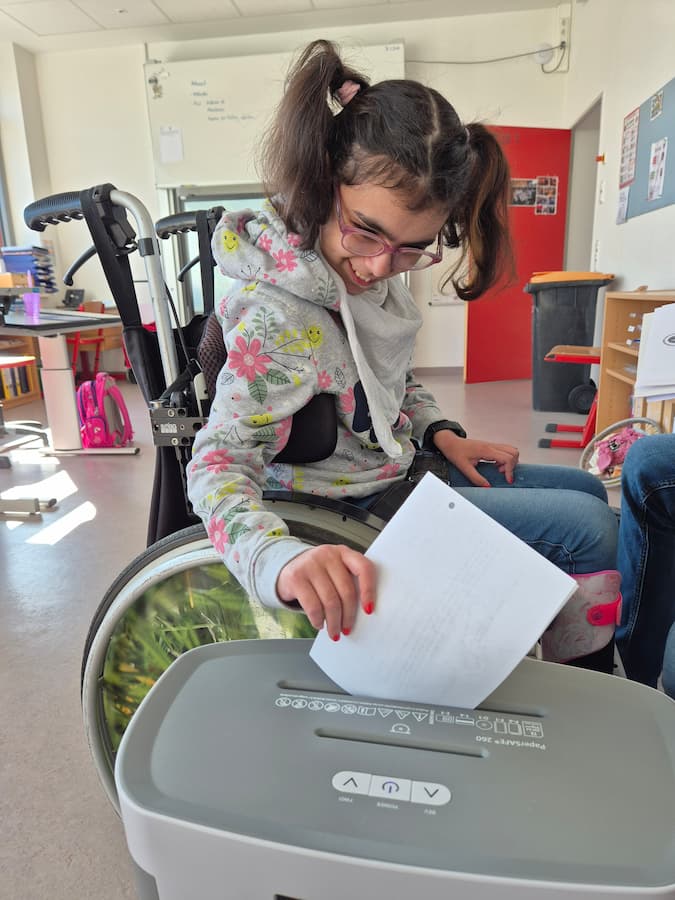 Wir arbeiten meistens in der Schule und kümmern uns um die Handtuchspender. Wir kontrollieren ob genug Handseife in den Spendern ist und füllen Handtücher und Seife auf. Wir erledigen auch die Aktenvernichtung und schreddern alte Akten und Zeugnisse, die keiner mehr braucht.